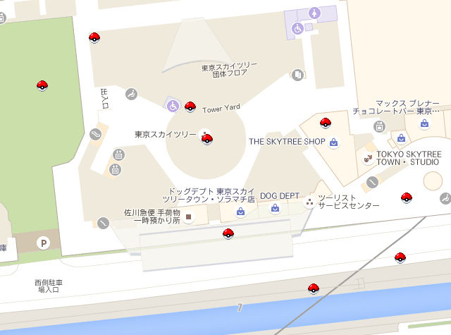 都心部はやはりポケストップが多く配置されているようだ。当然のようにスカイツリーのような箇所は