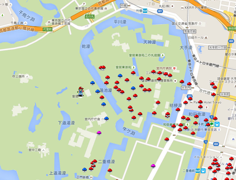 皇居内だけで30箇所のポケストップが確認されているが、皇居内は一般人は立ち入ることができない。