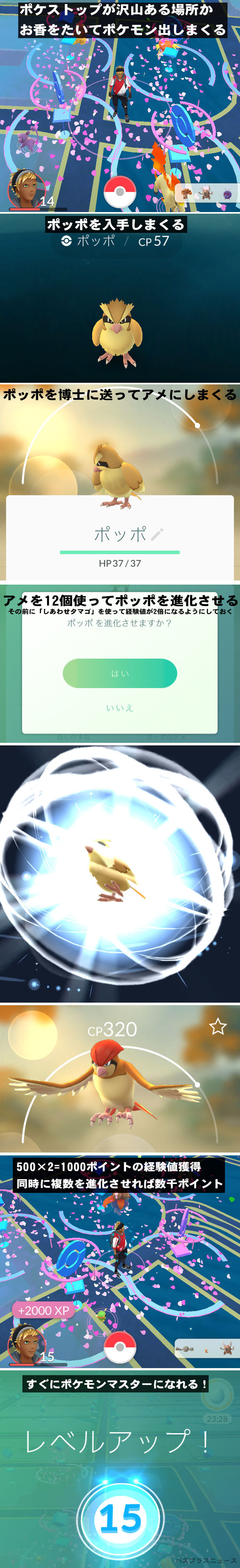 この方法を使用することにより似非れる経験値は、ポッポを集めるとき1匹につき100ポイント、ポッポを進化させるときに500ポイント、「しあわせタマゴ」を使用すればそれらが2倍になり、非常に高い経験値が得られます。